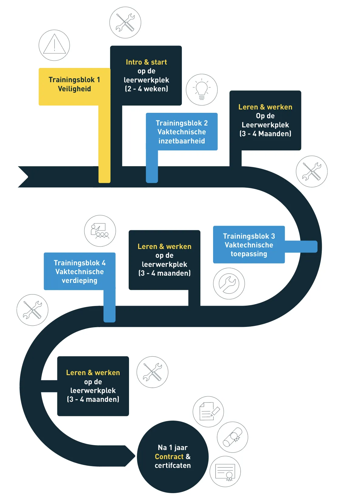 Je begint met een introductieperiode waarin je kennismaakt met je toekomstige werkplek. Vervolgens volg je verschillende blokken waarin je je vaardigheden verder ontwikkelt. Al deze praktijkervaring doe je op in een leerwerkplek.
